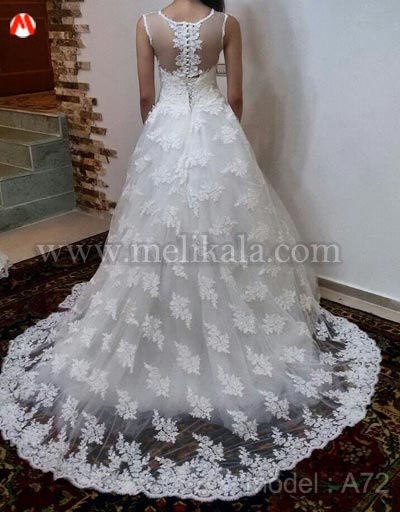 مدل لباس عروس A72 از جنس کامل پارچه ترک  کار شده و مدلی  بدون آستین و رکابی بوده پشت بالاتنه لباس با بند بسته میشود و تور ساده بوده  و مدل جلوی بالاتنه تور با طرحی همانند طرح پشت کار شده ودامن لباس به بالاتنه وصل بوده و تا پایین بر روی تور گل هایی طراحی شده و پایین دامن طرح دور تا دور لباس کار شده است ،این مدل لباس عروس دنباله دار بوده است وبرای تمام سلیقه ها انتخابی مناسبی است و این لباس راحت و سبک بوده و قدم برداشتن و حرکت کردن با آن بسیار ساده تر میباشد